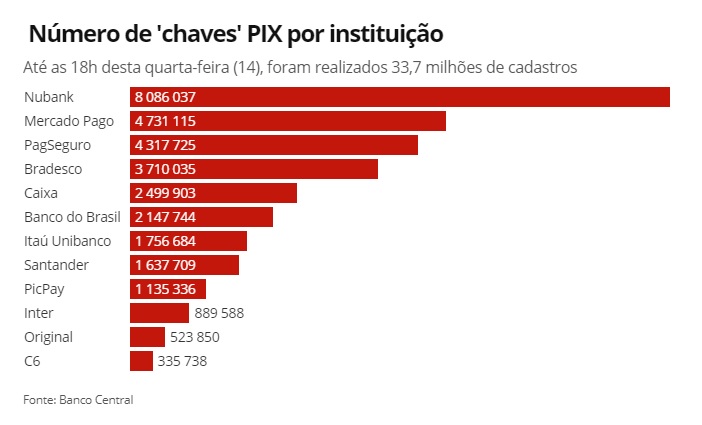O Nubank lidera a quantidade de cadastros de chaves, com 8 milhões. Em seguida, aparecem Mercado Pago (4,7 milhões de chaves), PagSeguro (4,3 milhões), Bradesco (3,7 milhões) e Caixa Econômica Federal (2,4 milhões).