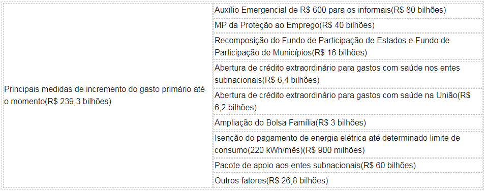 Outras medidas, como a redução a zero do IOF incidente sobre operações de crédito e redução de impostos incidentes sobre produtos médico-hospitalares e relacionados ao combate ao vírus, também explicam a perda de receita de R$69,7 bilhões.