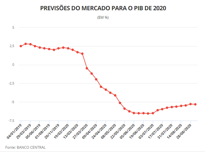 A expectativa para o nível de atividade foi feita em meio à pandemia do novo coronavírus, que tem derrubado a economia mundial e colocado o mundo no caminho de uma recessão. Nas últimas semanas, porém, indicadores têm mostrado o início de uma retomada da economia brasileira.
