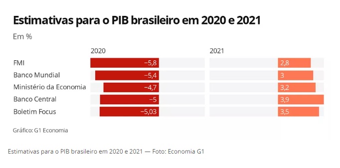 Houve melhora também nas estimativas para o Brasil: o FMI agora vê uma queda de 5,8% no PIB brasileiro este ano. Em junho, a estimativa era de um tombo de 9,1%, o maior em 120 anos. A entidade, no entanto, já havia apontado esta previsão para a economia nacional em um relatório específico sobre o país.